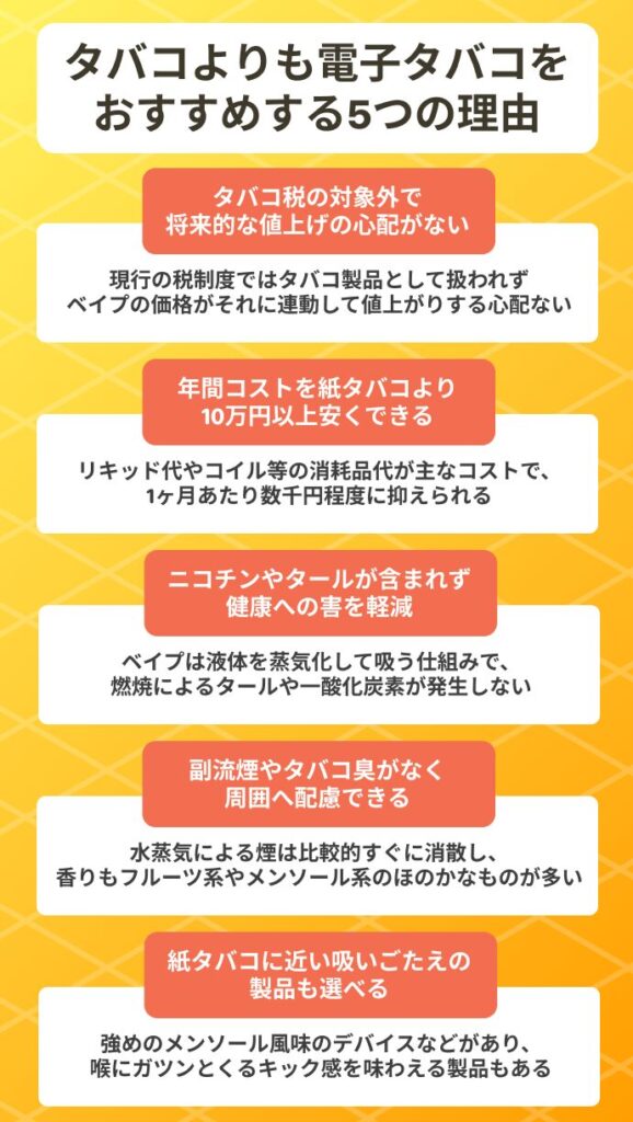 試算では、紙巻きからVAPE Xに切り替えることで年間10万円以上のタバコ代節約も期待できます。