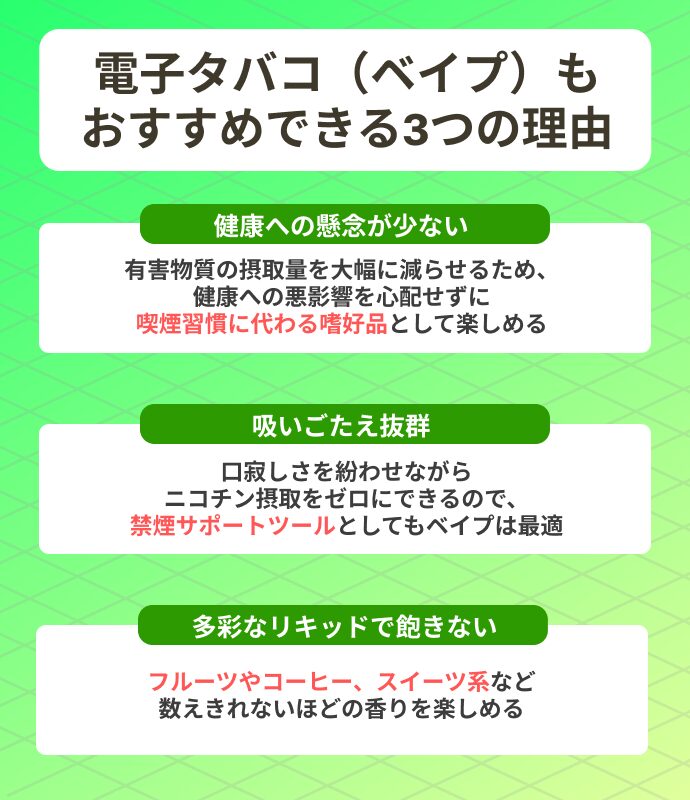 加熱式タバコやベイプを上手に活用すれば、周囲への気遣いや健康面の不安を軽減しながら、自分のペースで喫煙を楽しめるでしょう。