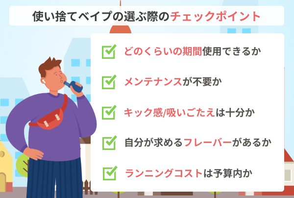 使い捨てベイプ(電子タバコ)選びに迷ったら、まずはこのポイントをチェックすることがポイントです。