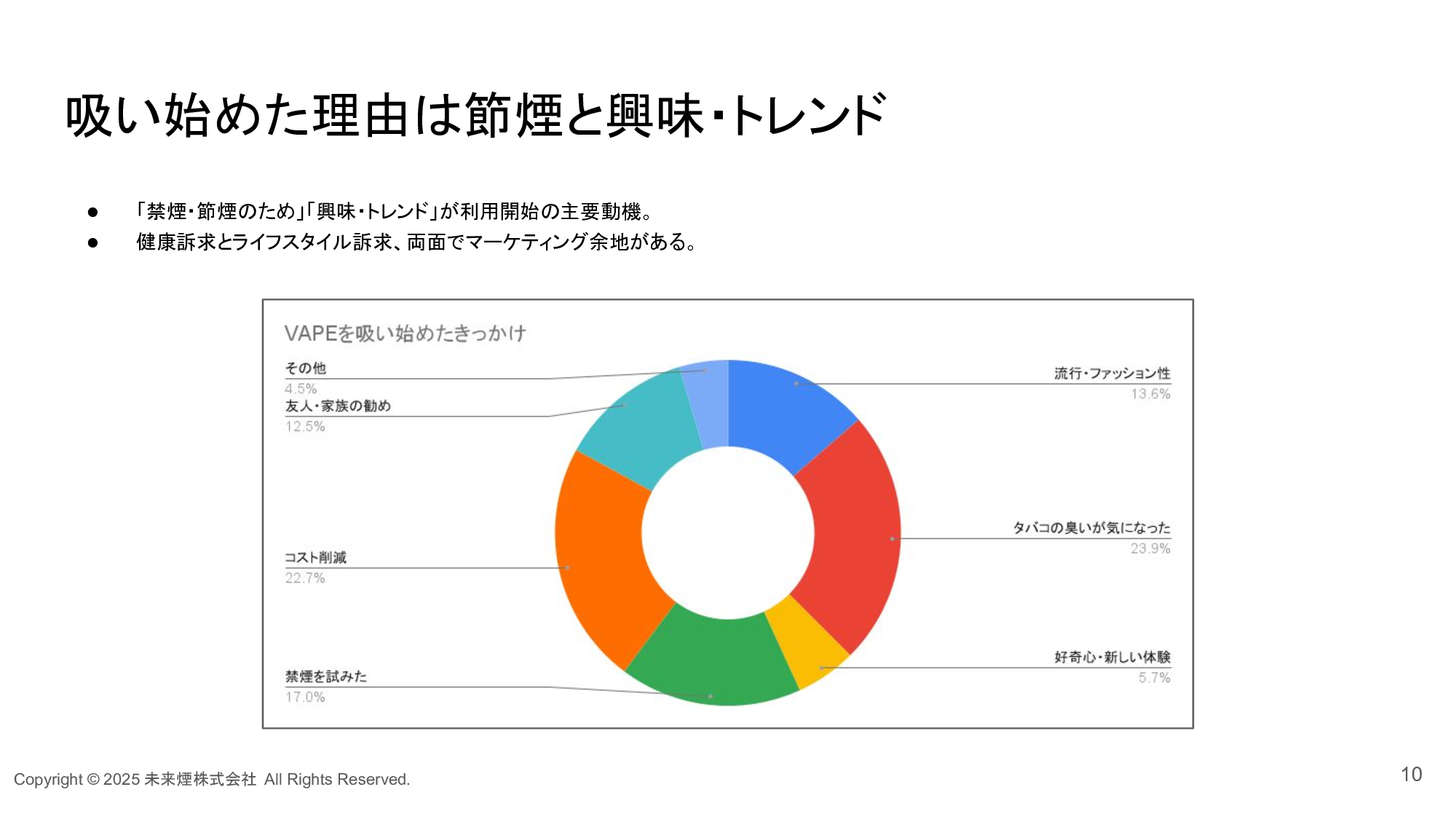 未来煙株式会社の調査レポートによると、ベイプを吸い始めた理由には「禁煙・節煙」や「興味・トレンド」などが挙げられています。
