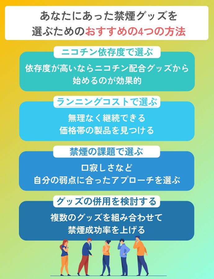 禁煙グッズは多種多様ですが、選ぶ基準を押さえれば迷わず自分に最適な一品が見つかります。ここでは依存度・費用・生活習慣など、失敗しない選び方のポイントを4つに絞って解説します。