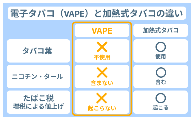 一方、電子タバコ(VAPE)はタバコ葉不使用のため、現状では日本のたばこ税の対象外です。