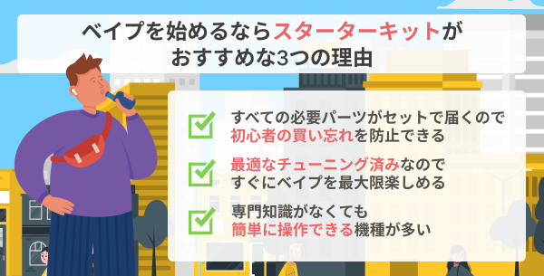 ベイプ(電子タバコ)を始めるなら、初心者に必要なものが一式そろったスターターキットが最適です。ここでは、スターターキットが初心者に特におすすめな理由を3つに分けて詳しく解説します。