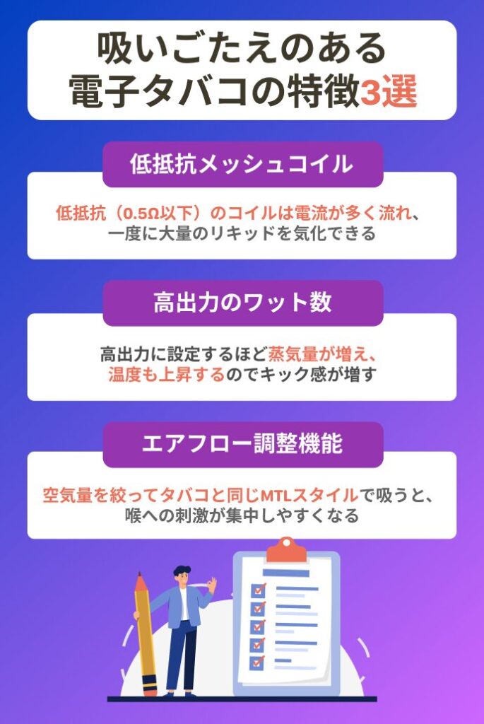 吸いごたえ(キック感)を重視した電子タバコ(ベイプ)には、共通しているポイントがあります。