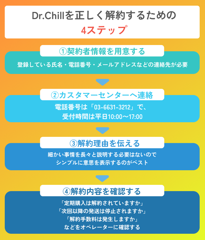 Dr.Chill(ドクターチル)の定期購入を解約する際は、必ず平日10:00~17:00の間にカスタマーセンターへ電話し、次回発送予定日の3日前までに手続きを完了させることが重要です。