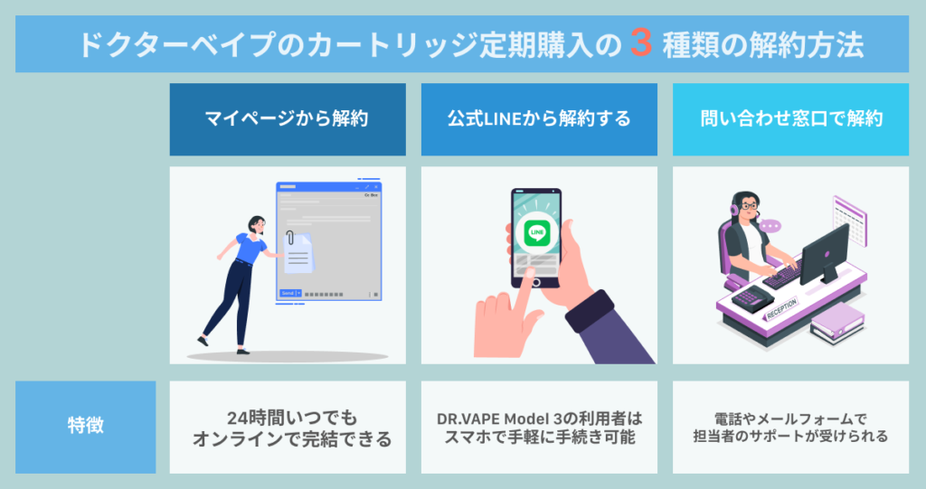 DR.VAPE(ドクターベイプ)Model 3のカートリッジ定期購入(スマートシップ)の解約方法について、マイページ、公式LINE、お問い合わせ窓口の3種類の手段を中心に解説しました。