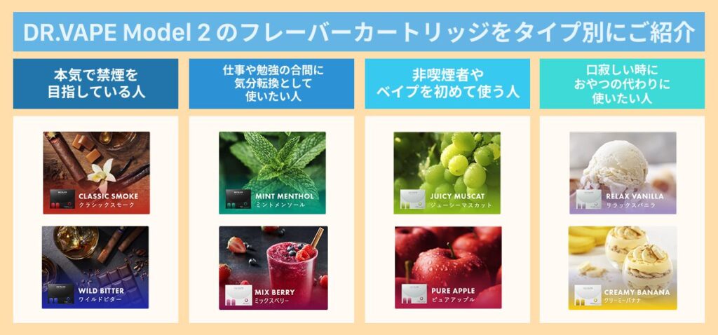こんな人におすすめ!DR.VAPE(ドクターベイプ)Model 2フレーバーカートリッジをタイプ別にご紹介