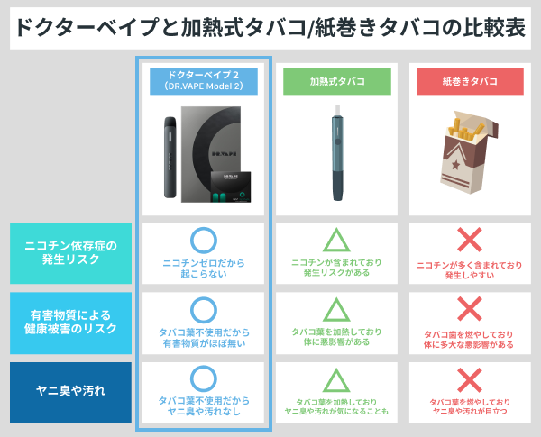 ドクターベイプはニコチン・タール・一酸化炭素がゼロの電子タバコ(VAPE)であり、紙巻きタバコや加熱式タバコと比べて健康への害が極めて少ないデバイスです。