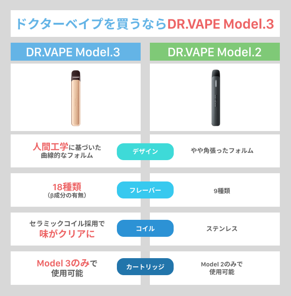 DR.VAPE(ドクターベイプ) のModel 2とModel 3には、大きく4つの違いがあります。それぞれわかりやすく解説します。