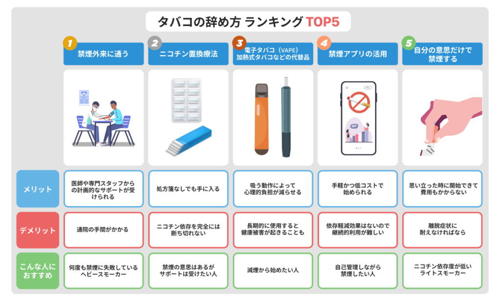 そこで本記事では、禁煙成功率の高いタバコの辞め方をランキング形式でご紹介します。