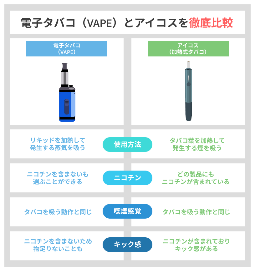 そのため「どうしても吸う動作がやめられない」という方にとっては、アイコスや電子タバコ(VAPE)のほうが、心理的な欲求を満たす可能性があります。