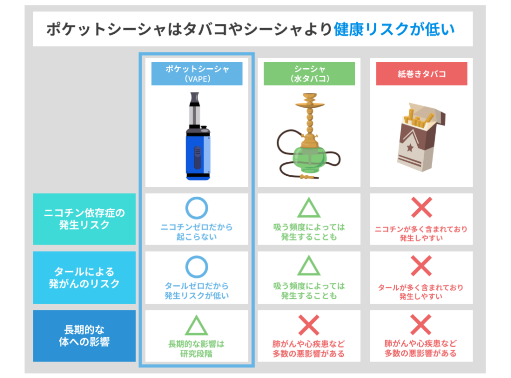 肺がんや心疾患の発症リスクを高める主要な因子が少ないことは、ポケットシーシャを選ぶ理由の一つとなるでしょう。