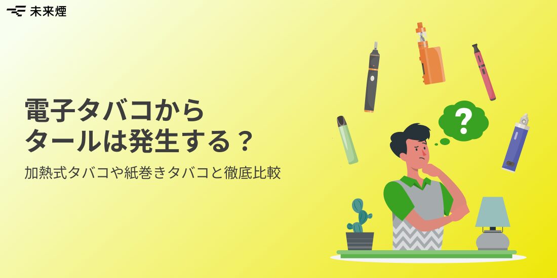 タールは紙巻きタバコの煙に含まれる黒いヤニ成分で、タバコ葉を燃やすことで発生します。電子タバコ(ベイプ)はタバコ葉を使わず、液体を加熱して蒸気を発生させるため、タールは基本的に発生しません。