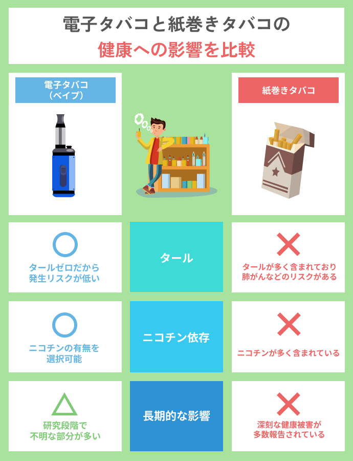 一方で、ニコチンの有無や蒸気の長期的な健康影響についてはまだ分からない点も多いため、最新の研究情報を確認しながら慎重に利用しましょう。