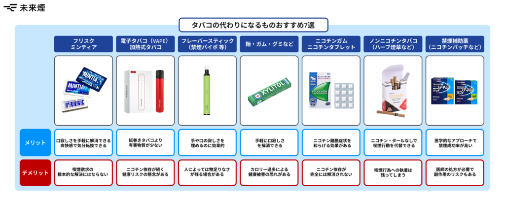 タバコの代わりになるものや禁煙中のストレス解消法には、フリスクやミンティアなどの手軽なお菓子、電子タバコ・加熱式タバコ、ニコチンガムや禁煙補助薬まで様々な選択肢があります。