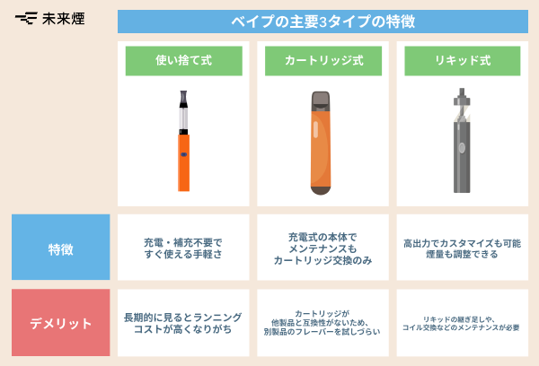 以下では使い捨てタイプ・カートリッジ式・リキッド注入式の3種類について特徴を説明します。