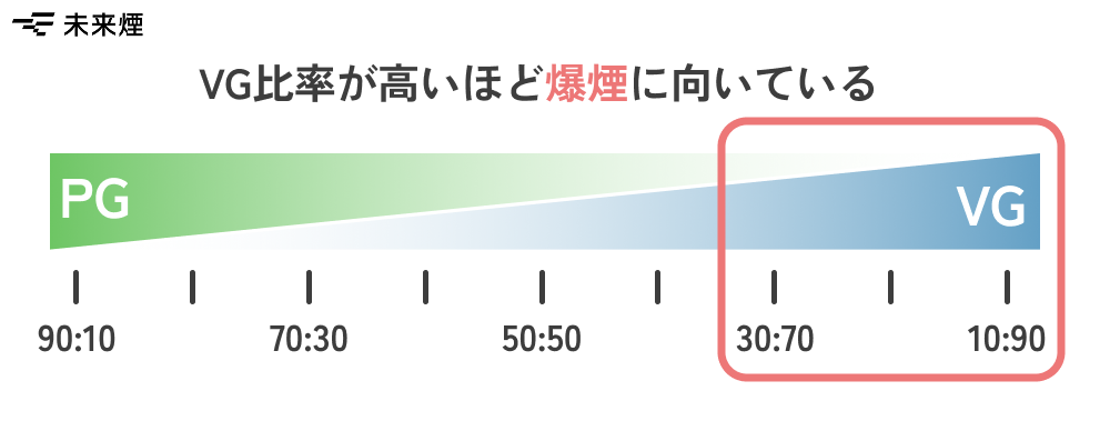 一方、PG比率の高いリキッドは煙の量が少なく喉への刺激が強くなるため、爆煙には向いていません。VGが多いリキッドは粘度が高く供給がやや遅くなりますが、デバイスのエアフローを開放し、大きく息を吸うことで解消できます。