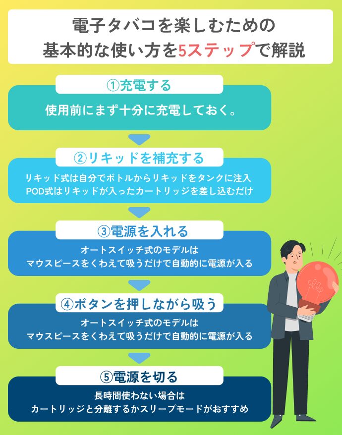 電子タバコ(ベイプ)を楽しむための基本的な使い方を5ステップで解説