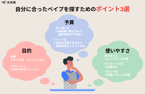 最後に、初心者が電子タバコ(ベイプ)を購入する際に押さえておきたい重要ポイント3つを紹介します。